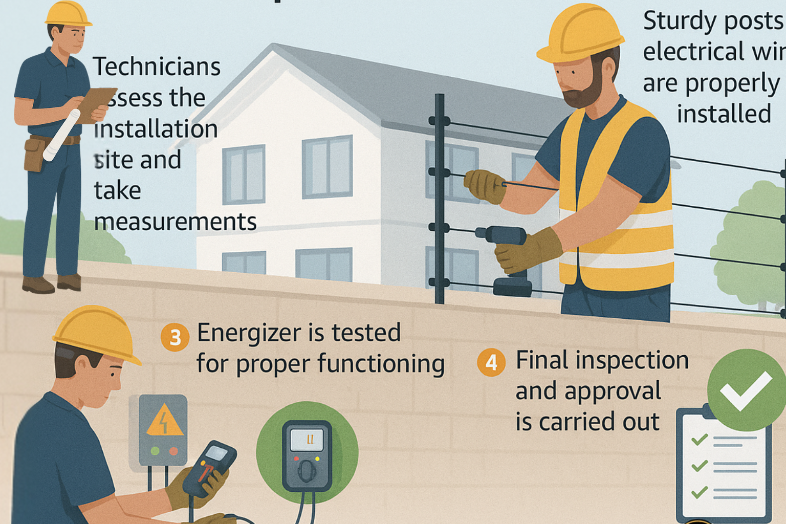 The installation of an electric fence is a professional process that ensures maximum safety, durability, and efficiency. At Electro Serve Fence , our trained team follows international standards to design and install fencing systems according to the specific needs of your property. We use high-quality materials such as stainless steel rods, tension springs, insulators, and advanced energizers to guarantee long-lasting performance.Each fence is carefully planned, with proper alignment and grounding, to create a secure barrier that deters intruders while remaining safe for people and animals. With our expert installation, you can be confident that your property is protected by a reliable, modern, and maintenance-friendly security solution.